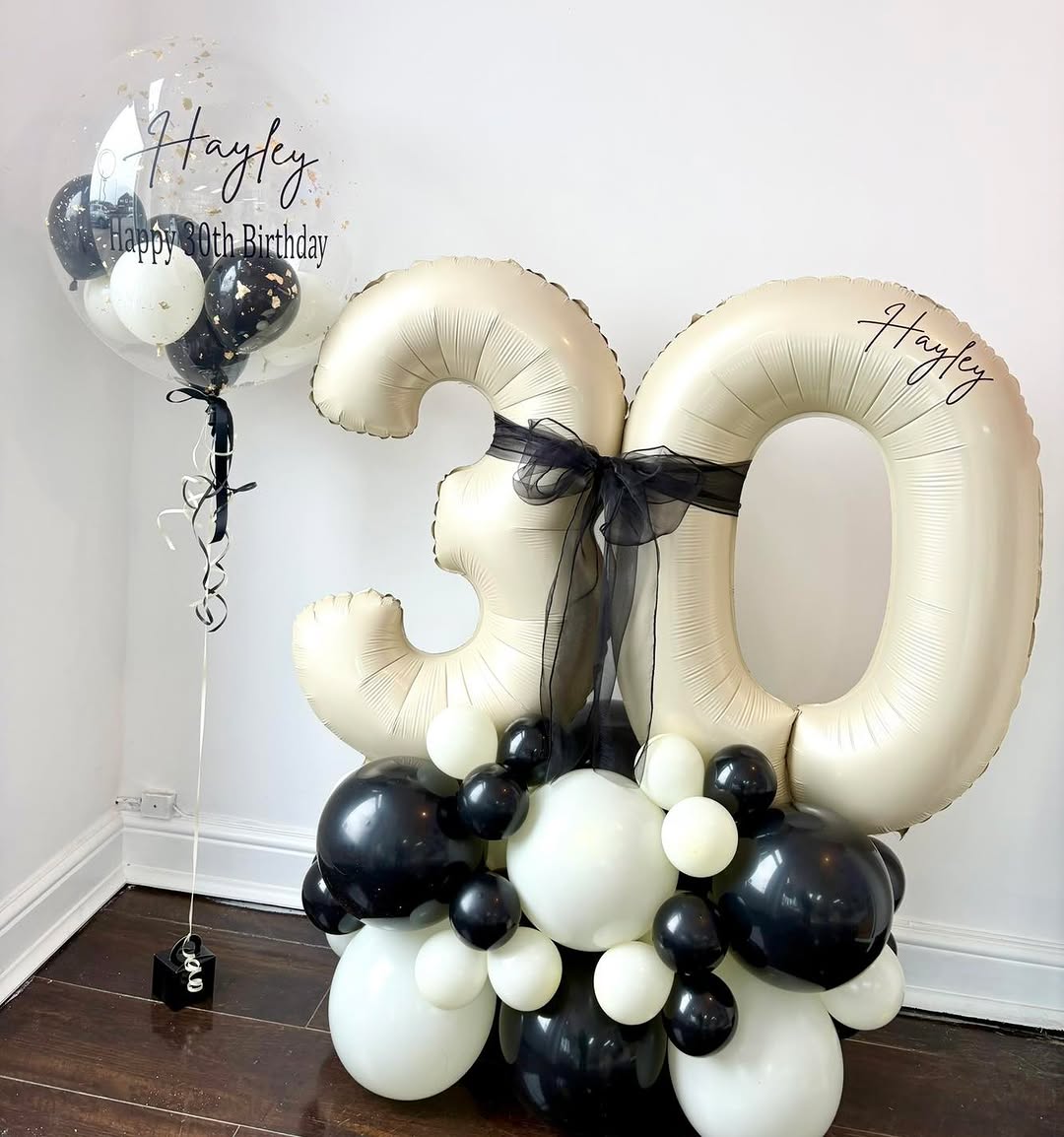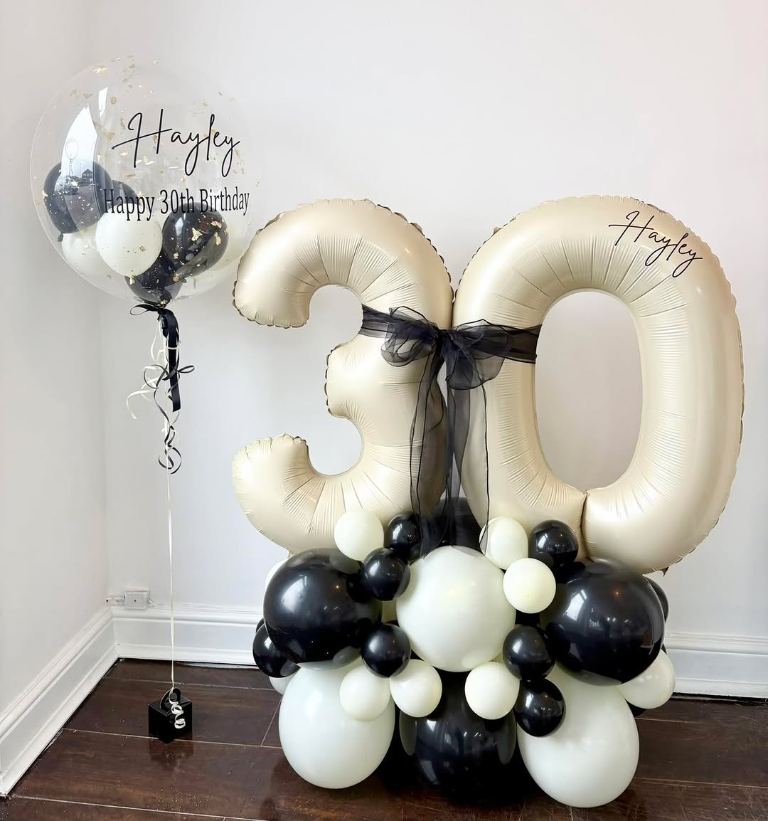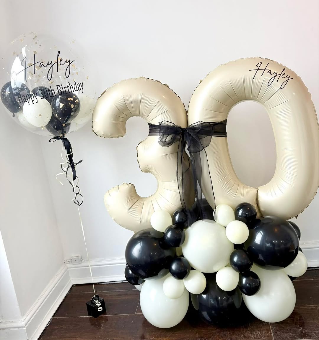 Celebrate your special occasions in style with this sophisticated balloon arrangement. This set features large, champagne gold number foils finished with an elegant black tulle bow and anchored by a modern organic base of matte black and white balloons. Accompanying the stack is a crystal-clear personalised bubble balloon, filled with a mix of mini balloons and delicate gold leaf accents. From these bespoke bubble balloons to our signature number stacks and organic set-ups, we ensure every detail is tailored to your event. It is a striking centerpiece designed to bring a premium, professional touch to any milestone birthday or anniversary.
